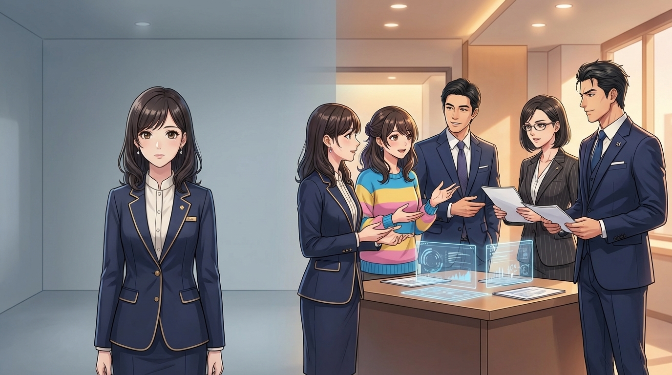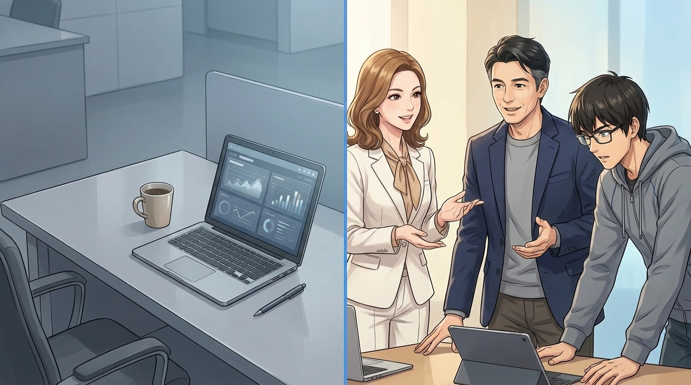 When an AI employee with a role and continuity sits inside the organization, "who to ask for what" stabilizes. With tool-type AI, the user has to decide each time which AI to ask for which task. With an AI employee, the routing is instant: "this one goes to the front-office lead," "this one goes to the engineering lead," "this one goes to the CFO-equivalent."