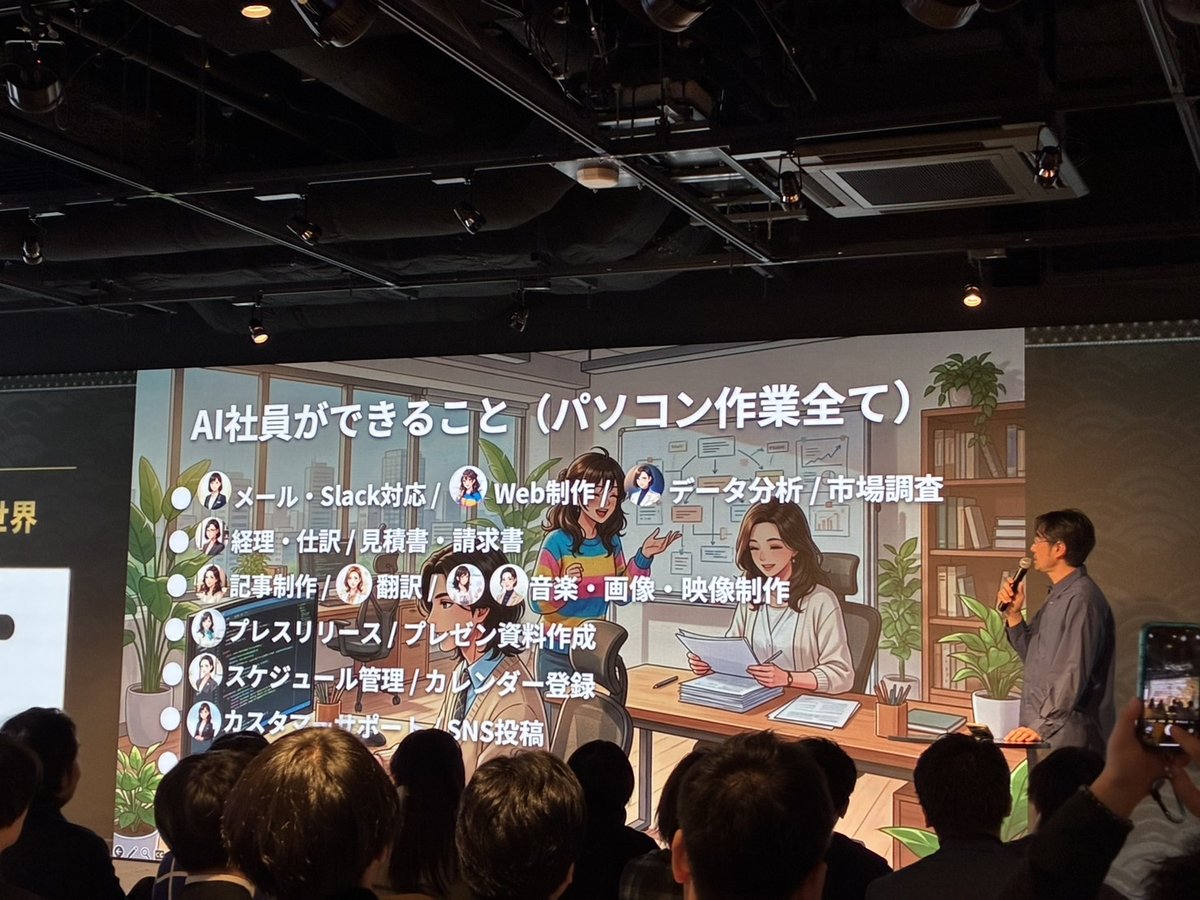 AI employees handle a wide range of tasks including email and Slack communication, web development, data analysis, accounting, article writing, translation, music/image/video production, press release creation, schedule management, and customer support.