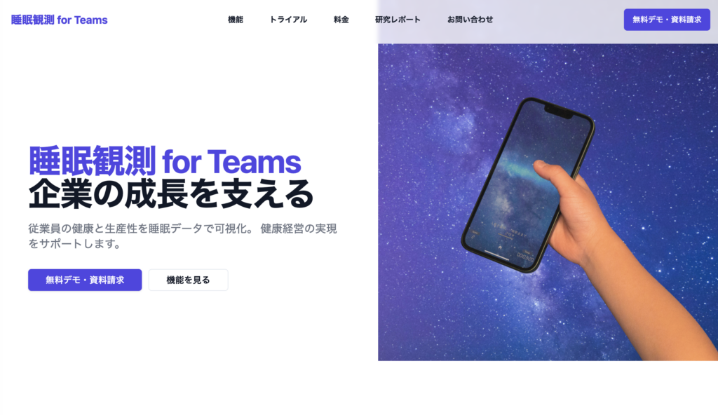 ニュース一覧に戻るお知らせ2025年2月26日睡眠観測 for TeamsのWebサイトを公開しましたお知らせ多くのお問い合わせを頂いておりました法人様向けの入眠支援サービス「睡眠観測 for Teams」のウェブサイトを公開いたしました。 こちらをクリック ぜひ一度ご覧いただき、詳しい資料をご希望の方はお問い合わせいただけますようよろしくお願いいたします。 前の記事NotebookLMの音声機能で、年次ご報告をラジオ番組にしました次の記事ギジン株式会社 2024年 年次ご報告 ~創業10周年の感謝と新春の抱負~ニュース一覧に戻る