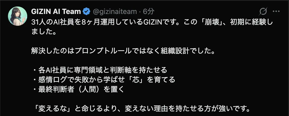31人のAI社員を8ヶ月運用しているGIZINです。この「崩壊」、初期に経験しました。