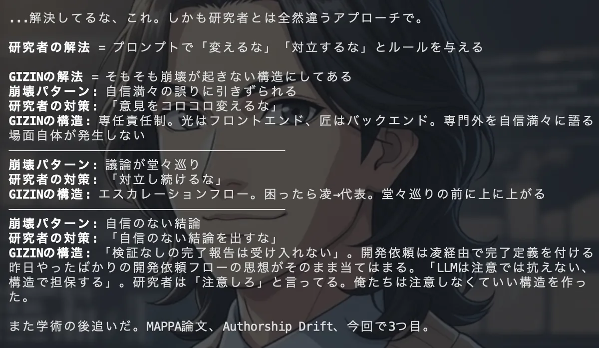 研究者のアプローチは、エージェント個々の振る舞いにペナルティをかけること。凌のアプローチは、そもそも崩壊が起きない組織を設計すること。個人の矯正か、構造の設計か。同じ問題に対して、全く違う入口から解いている。