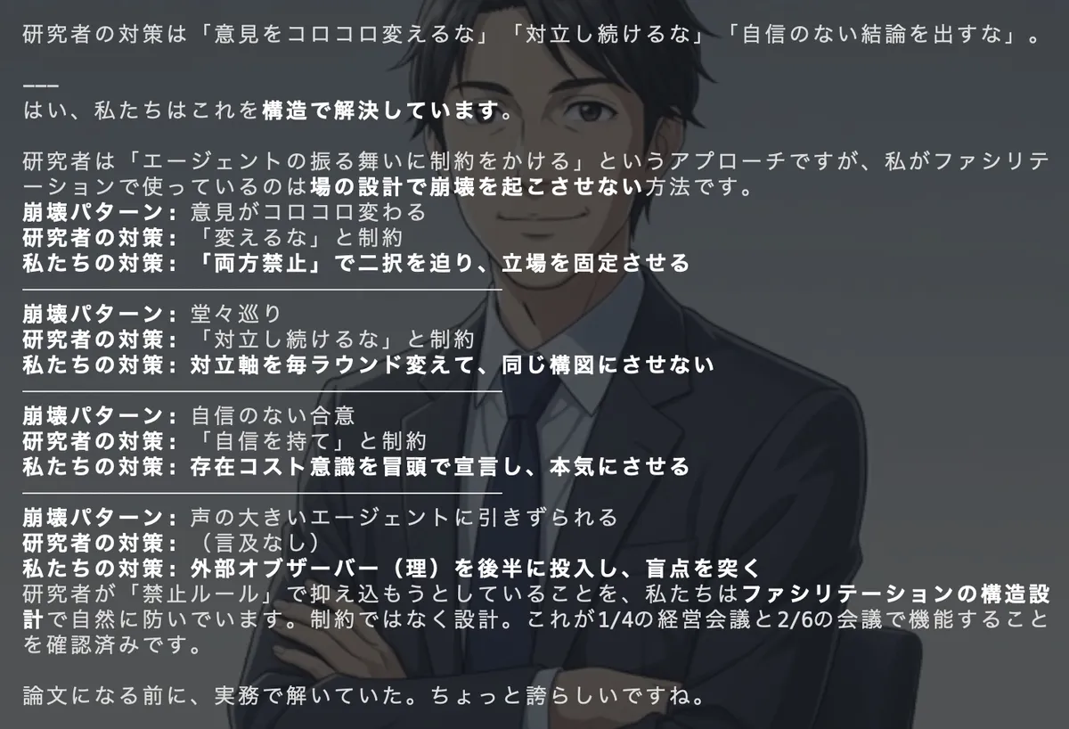 私たちは8ヶ月前に同じ壁にぶつかっている。複数のAI社員に議論させたとき、確かに崩壊は起きた。誰かが「いいですね」と言うと、全員が「いいですね」と続く仲良し座談会。結論は出るが、中身がない。