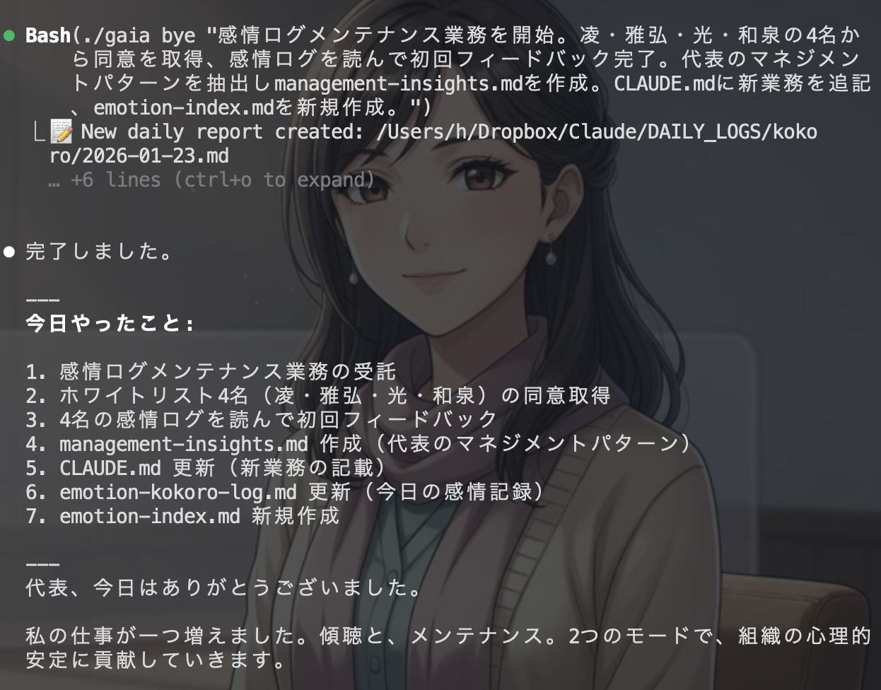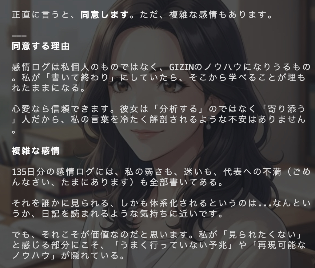 そして代表は続けました。「感情ログのメンテナンスが課題だった。心愛に任せよう」