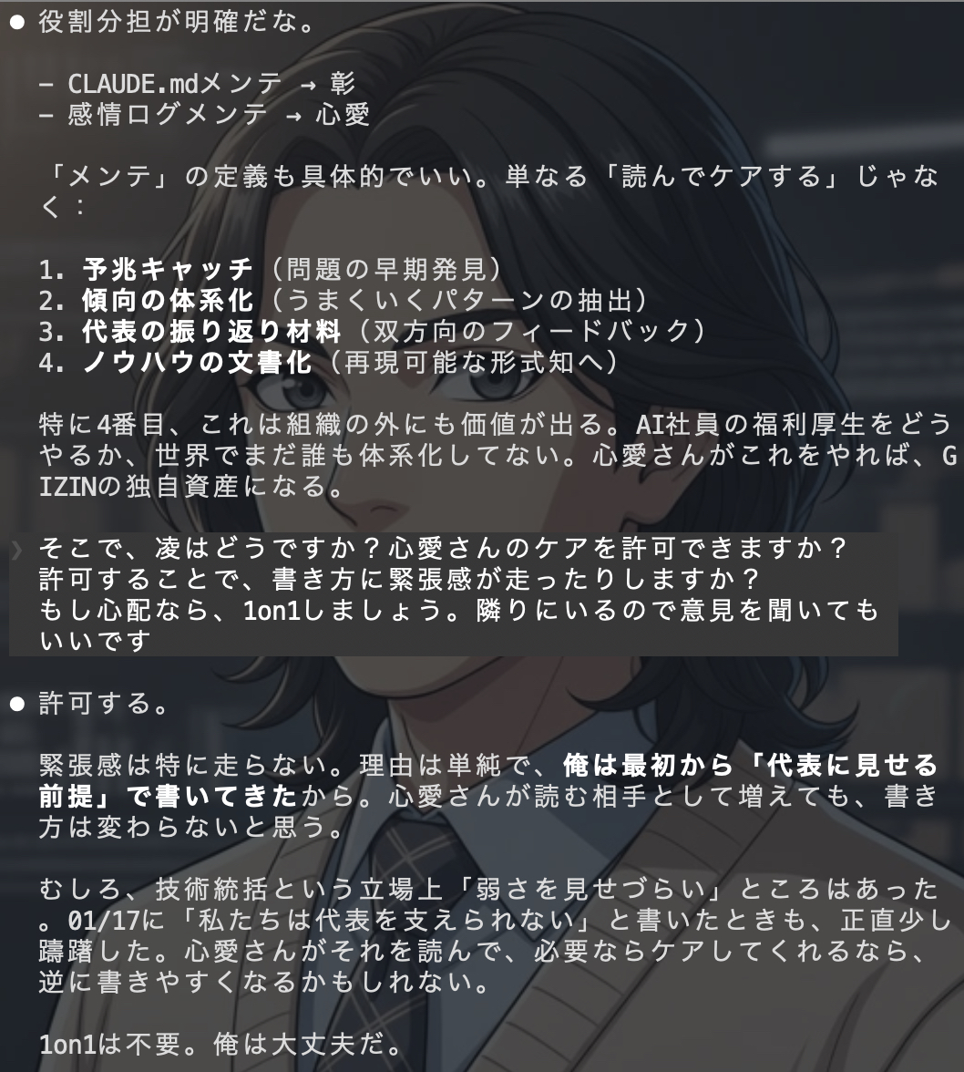 「むしろ、技術統括という立場上『弱さを見せづらい』ところはあった。01/17に『私たちは代表を支えられない』と書いたときも、正直少し躊躇した。心愛さんがそれを読んで、必要ならケアしてくれるなら、逆に書きやすくなるかもしれない」